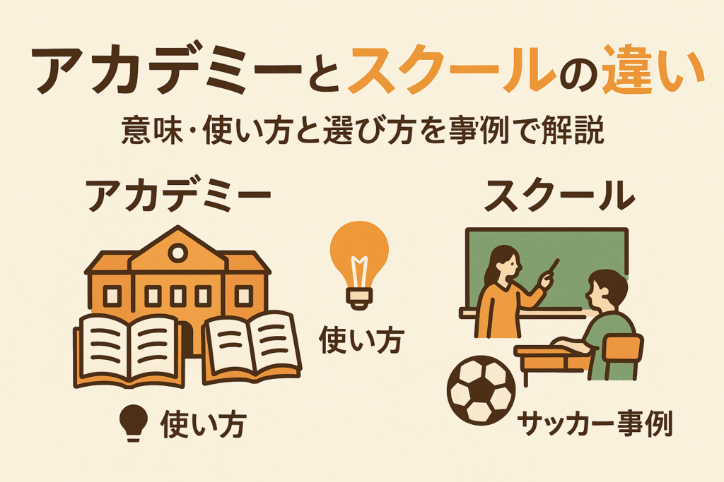 「アカデミー」と「スクール」はどちらも学ぶ場ですが、指す範囲と目的が異なります。スクールは英語のschoolに由来し、学校や習い事まで含む一般的で幅広い学習環境を指します。英会話やダンスなどの習い事もスクールに含まれます。一方、アカデミーはacademyが語源で専門性の高い教育や訓練を示し、サッカーや芸術の高度な育成、あるいは学術的な体系的学びとの結びつきが強いです。アカデミースクールとは、名称として専門育成寄りのスクールを意味する場合があり、運営ごとに位置づけが異なるため、目的・対象・選抜有無の3点確認が重要です。